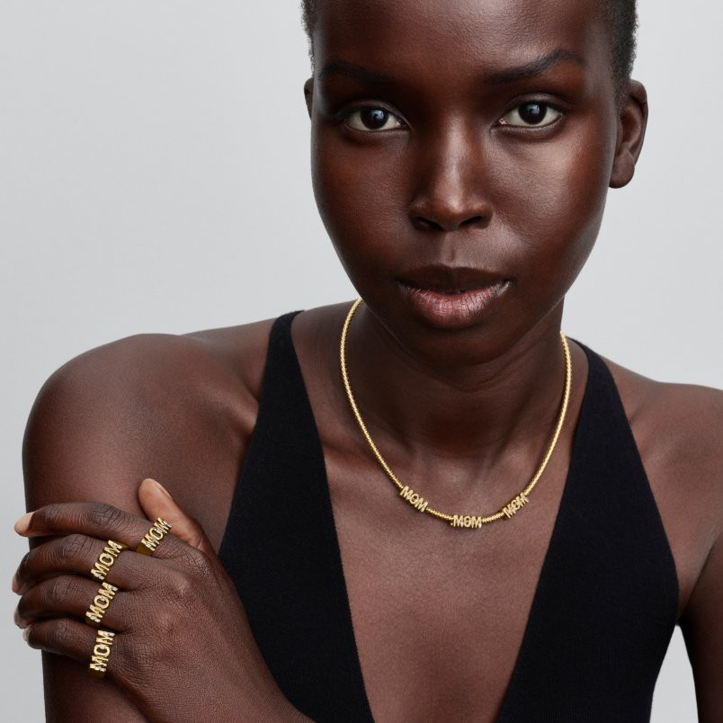 A nő. Az ikon. 14 karátos arannyal futtatott gyűrűnk jellegzetessége a széles, körívet formáló karika és a körív két végét összekötő, szikrázó, baguette csiszolású kövekkel díszített „MOM” szó. Egy feltűnő tisztelgés az anyaság és az egész életen át tartó kötelékek előtt.