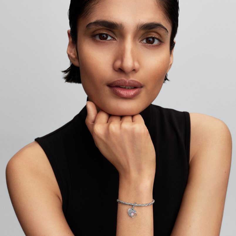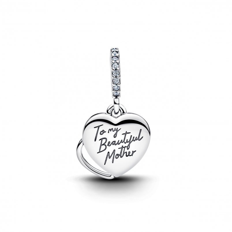 A kézzel megmunkált sterling ezüst charm jellegzetessége a két szív alakú függő. Az egyiket szikrázó mozaikhatás és kivágott szív díszíti. A másikat pedig egy laboratóriumban előállított opál és a „To my Beautiful Mother” gravírozás.