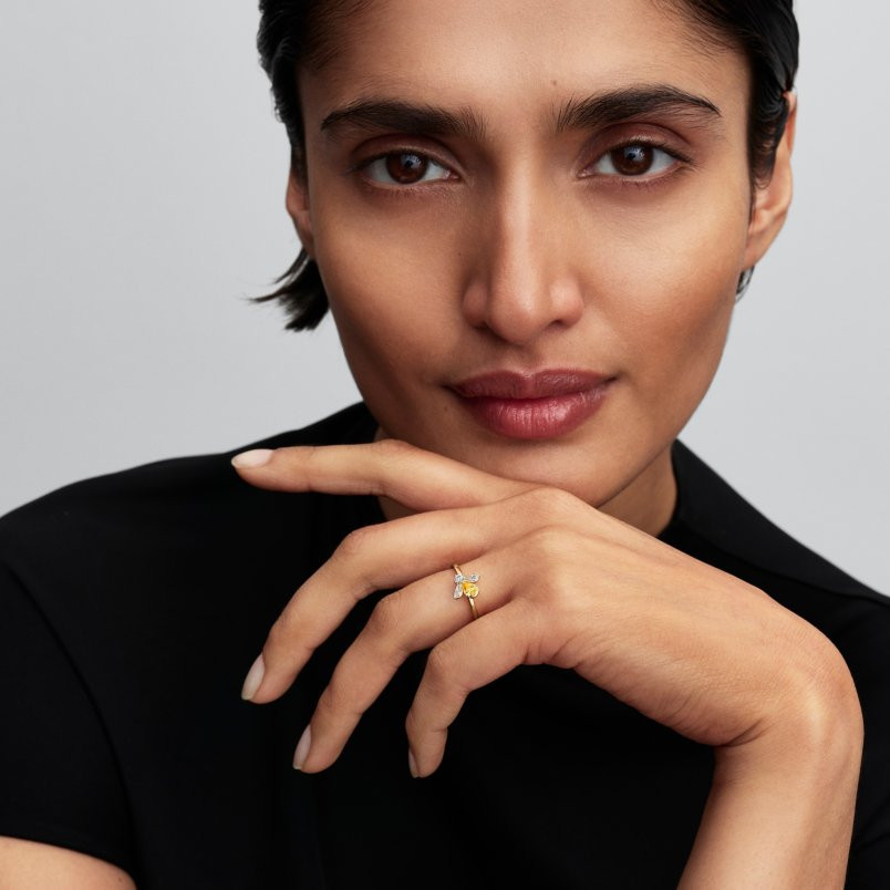 Tedd zümmögővé a stílusodat! 14 karátos arannyal futtatott gyűrűnk jellegzetessége a különböző csiszolásokkal és foglalásokkal rendelkező egy élénksárga és több áttetsző kő alkotta méh motívum. Méhkirálynőhöz illő édes csillogás.