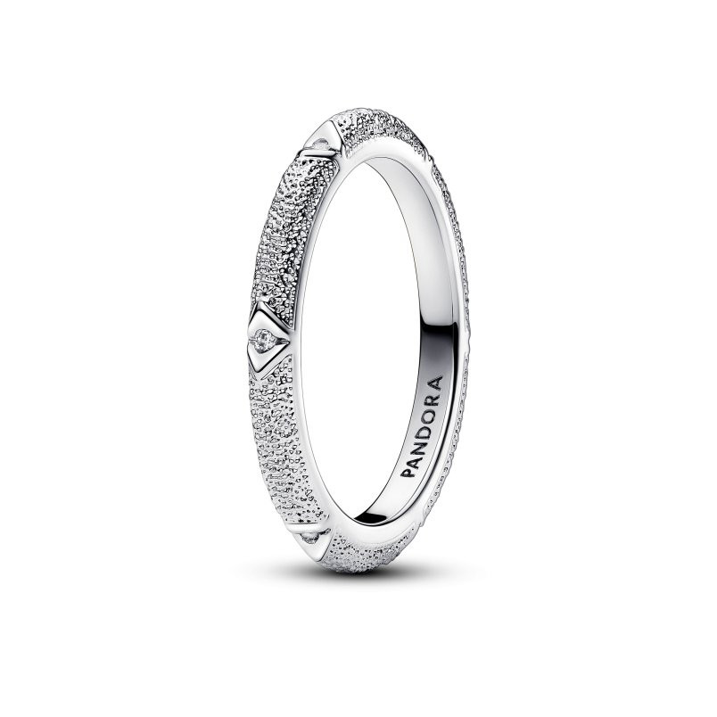 Érezd a kifinomultságot a Pandora ME sterling ezüst gyűrű viselésekor! A D alakú profilú karikán hat háromszög alakú nyílás található, amelyekben ragyogó kövek csillognak. A texturált mintázat az óceán hullámait és a homok finom szemcséit idézi, stílusos és elegáns kiegészítővé téve ezt az ékszert.