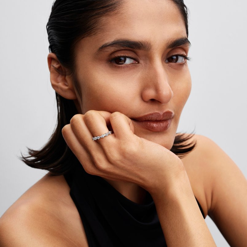 Öltözz csillogásba! Ez a sterling ezüst gyűrű három, kövekkel díszített masnival ünnepli az élet gondosan összefonódó pillanatait.