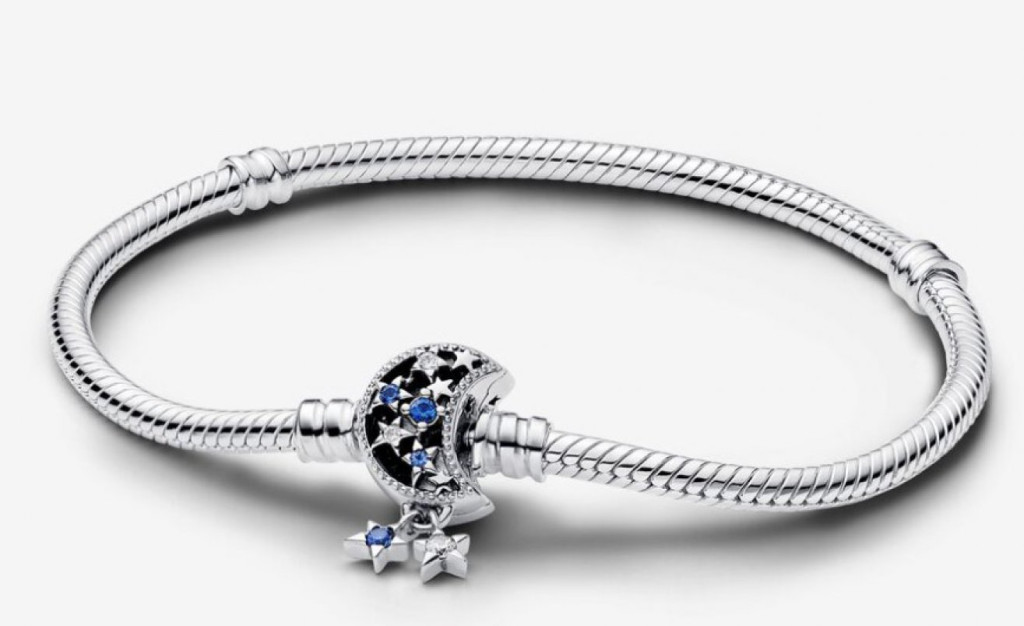 Vigyél égi varázst a megjelenésedbe a Pandora Moments szikrázó holdkapcsos kígyólánc karkötővel! Ez a sterling ezüst karkötő elegáns félhold alakú kapoccsal büszkélkedik, amelyen a „Dream big” gravírozás emlékeztet arra, hogy mindig merj nagyot álmodni. A kapocs aprólékosan kidolgozott részletei – kék mesterséges kristályok, áttetsző cirkóniák, mikrogyöngyök és domborított díszítések – tökéletes harmóniát sugároznak. A lógó csillagok játékos csillogást adnak az ékszernek, tökéletes kiegészítővé téve minden alkalomra.