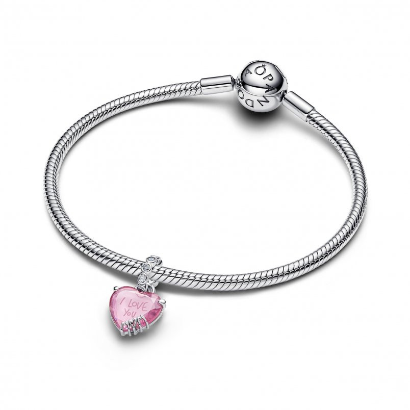Mondj el mindent az idei anyák napján gravírozott szív függő charmunkkal! Sterling ezüstbe foglalt szív alakú rózsaszín kő; a foglalatot a „MOM” szó egészíti ki. Magán a szíven pedig az „I LOVE YOU” üzenet olvasható.