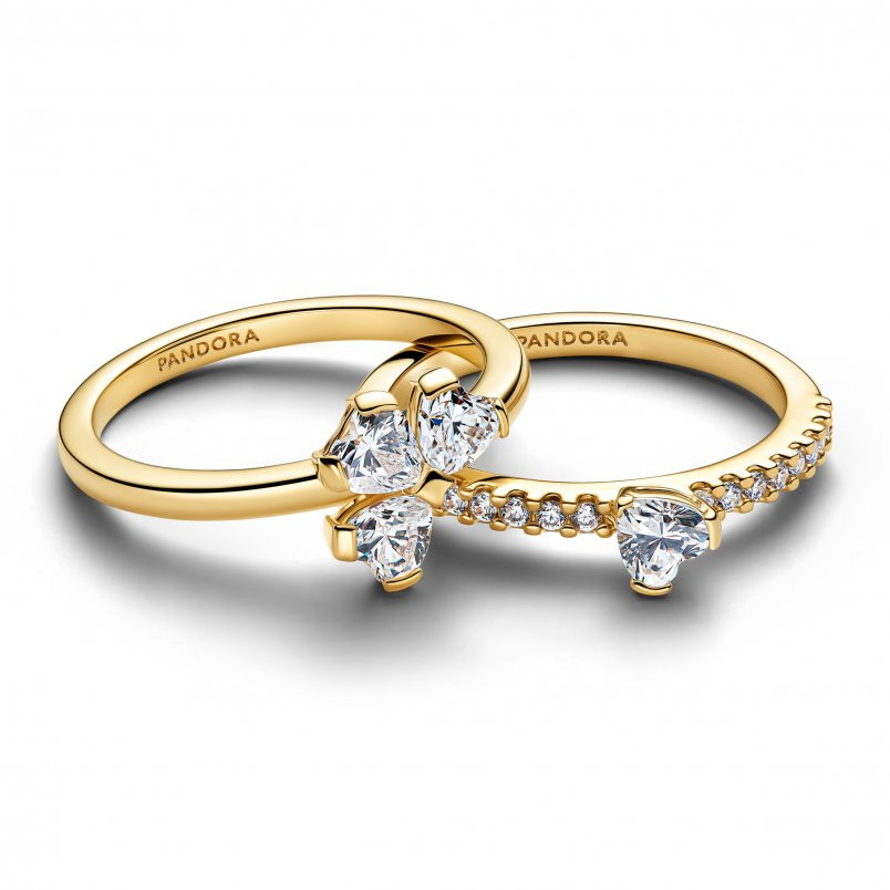 Ne csak várd a szerencsét, viseld is! A 14 karátos arannyal futtatott, szétválasztható szett két gyűrűt tartalmaz – az egyik jellegzetessége három szív alakú kő, a másiké pedig egyetlen szív és a fél pavé karika, a mindennapi szerencsehozó ragyogásért.